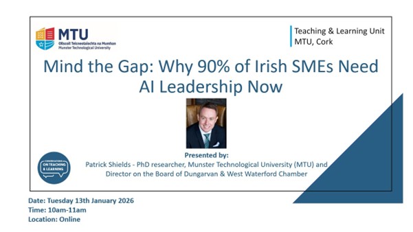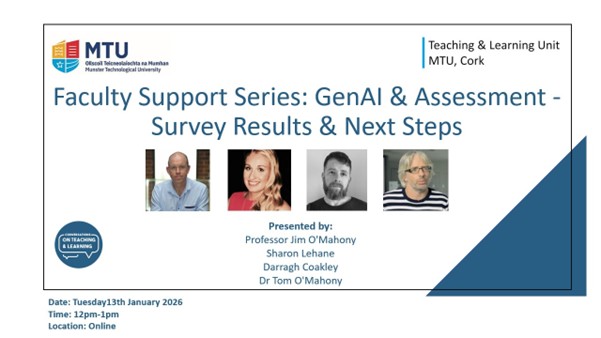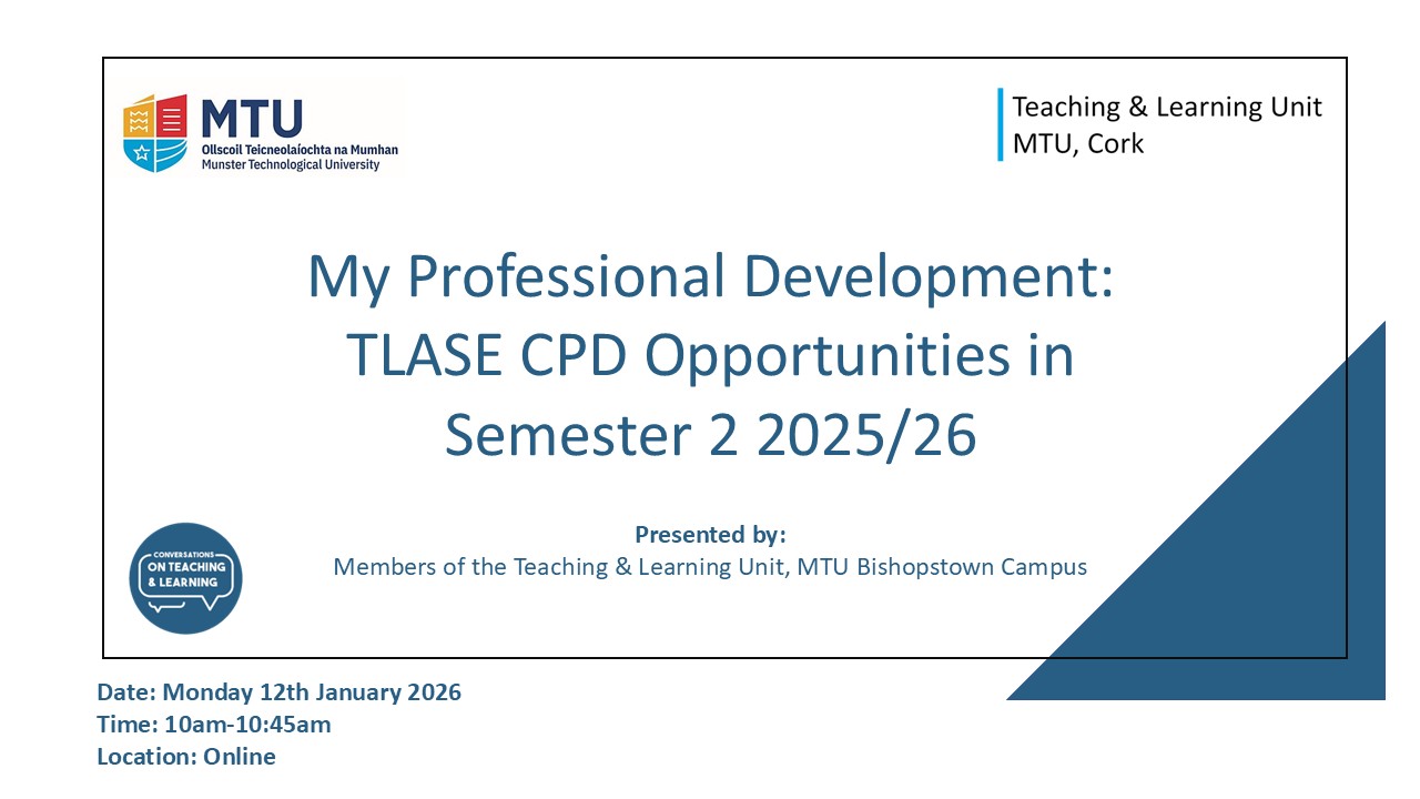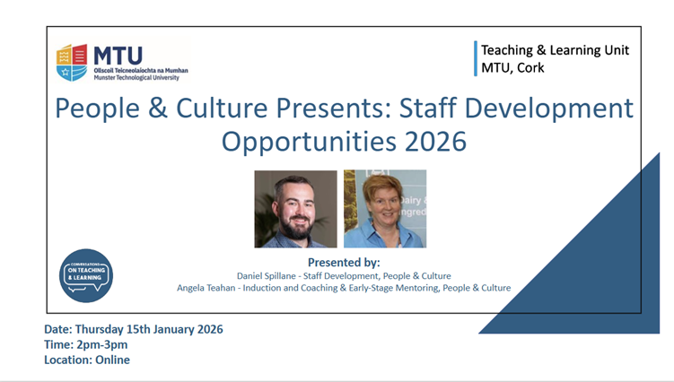 Monday, 12 January 2026, 10:00 – 10:45 Seminar Description Each academic year, the Teaching and Learning Unit (TLU) offers an important range of relevant, useful and accessible formal continuing professional development opportunities related to teaching, learning, assessment and student engagement (TLASE) to MTU staff.